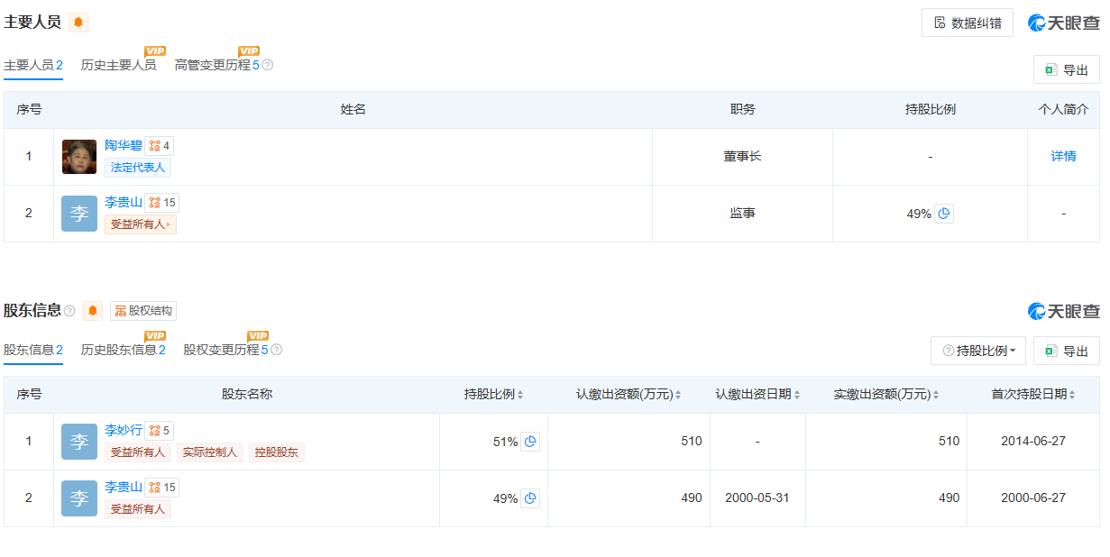 天眼查信息数据显现,早在2014年6月,老干妈的创始人及法定代表人陶华碧便退出了股东阵营。此后由陶华碧的长子李贵山持股49%,次子李妙行持股51%,李妙行现为实践操控人。